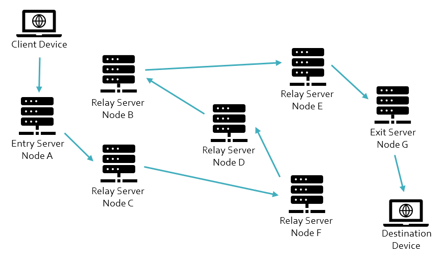 The message is then passed from the relay server, ‘Node E,’ to the exit server, ‘Node G.’ This server is able to strip away the final layer of encryption using its session key. This allows ‘Node G’ to identify that the data needs to be routed to the destination device.