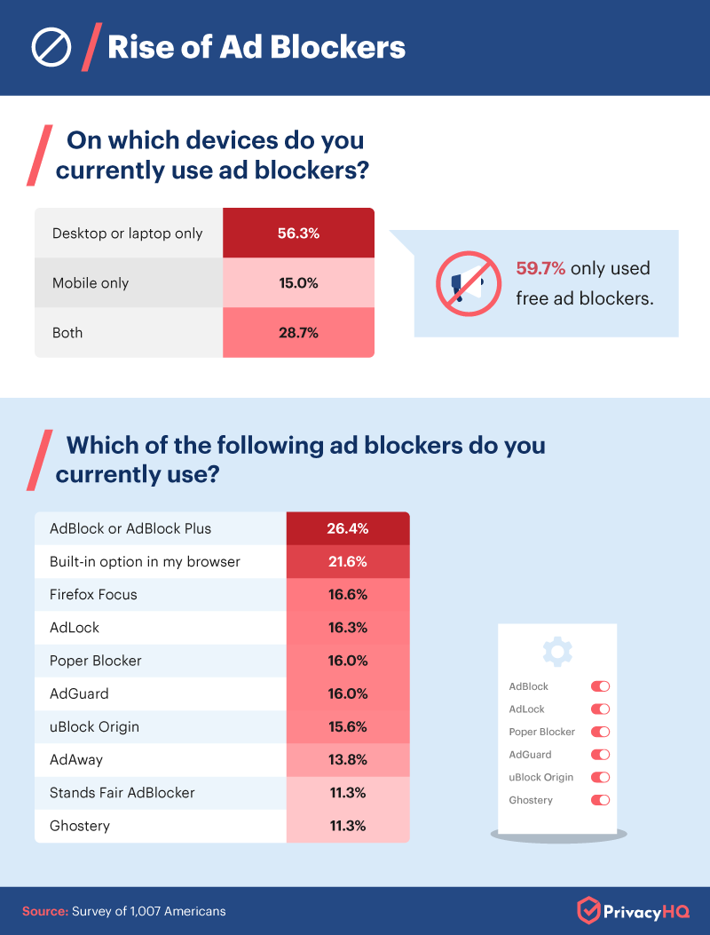 Until social media platforms decide to offer paid ad-free experiences, another way to cut down on internet ads is by using an ad blocker. Many of these are free to use, and they come in the form of a browser extension or mobile app which prevents ads from displaying while you browse. We found that the most popular option was AdBlock or AdBlock Plus, and the least popular was a tie between Stands Fair and Ghostery.