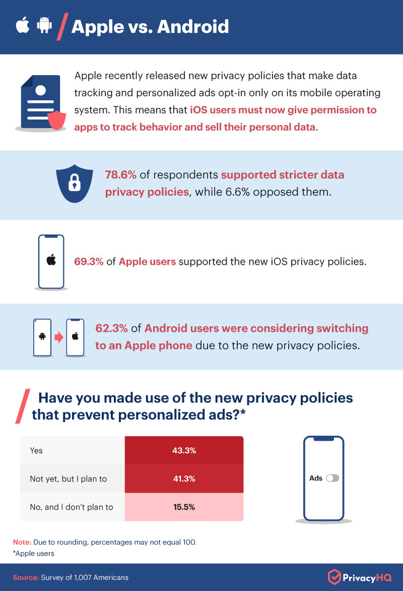 This could pose a problem for Apple’s competitor, Android, which currently leads the mobile market. Of Android users surveyed, 89.4% said that they, too, would like the option to prevent apps from tracking their personal data, and more than 62% of Android users have considered switching to Apple because of their new privacy policy.