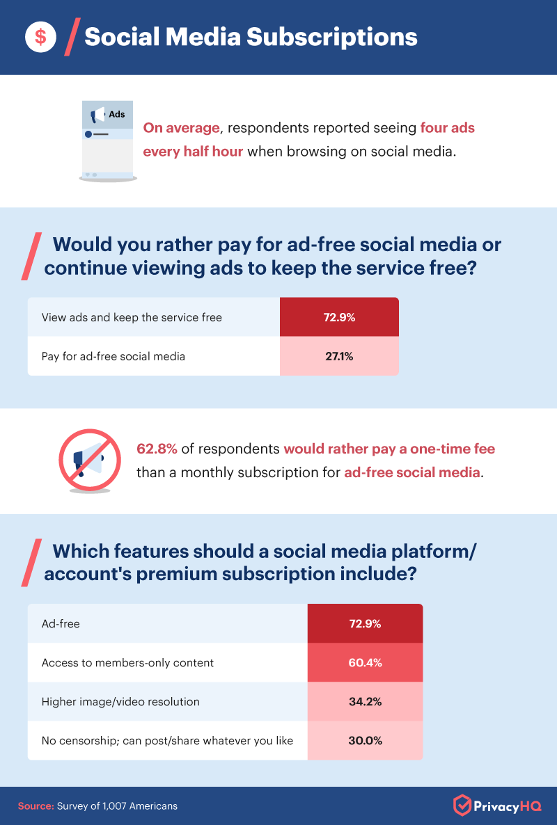 Although social media users claimed to see an average of four ads every 30 minutes, 72.9% of respondents said they’d prefer to keep seeing ads than have to pay for ad-free social media. Social media ads weren’t enough of an annoyance for many people to pay to get rid of them; however, the majority of those willing would prefer to pay a once-off fee than a monthly subscription. An ad-free experience was also the most popular feature for hypothetical premium subscription accounts.