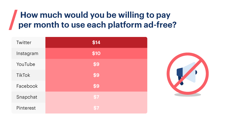 If respondents were to pay for an ad-free experience, how much would they be willing to spend? Twitter users may be the most fed up with social media ads; people said they’d pay up to $14 per month for an ad-free Twitter. Meanwhile, they only wanted to pay half that to remove ads from Snapchat or Pinterest.